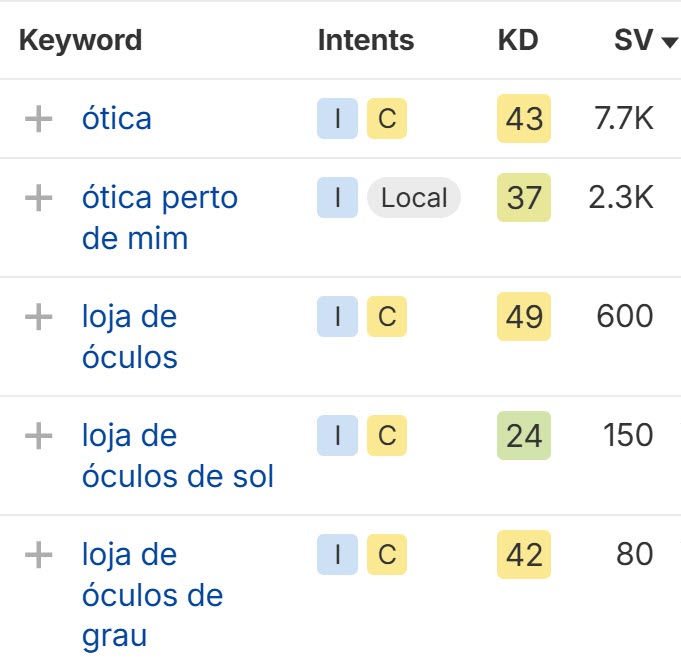 - Trocar a categoria principal de “Loja de óculos de sol” para “Ótica”. Essa mudança deixa o perfil muito mais alinhado com a forma como as pessoas realmente buscam esse tipo de serviço. Para reforçar, mostrei que termos como “ótica” e “ótica perto de mim” somam 10.000 buscas mensais, enquanto “loja de óculos de sol” aparece em apenas 150 pesquisas.